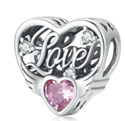 925 Sterling Silver Pink Wing Heart Bead Charm